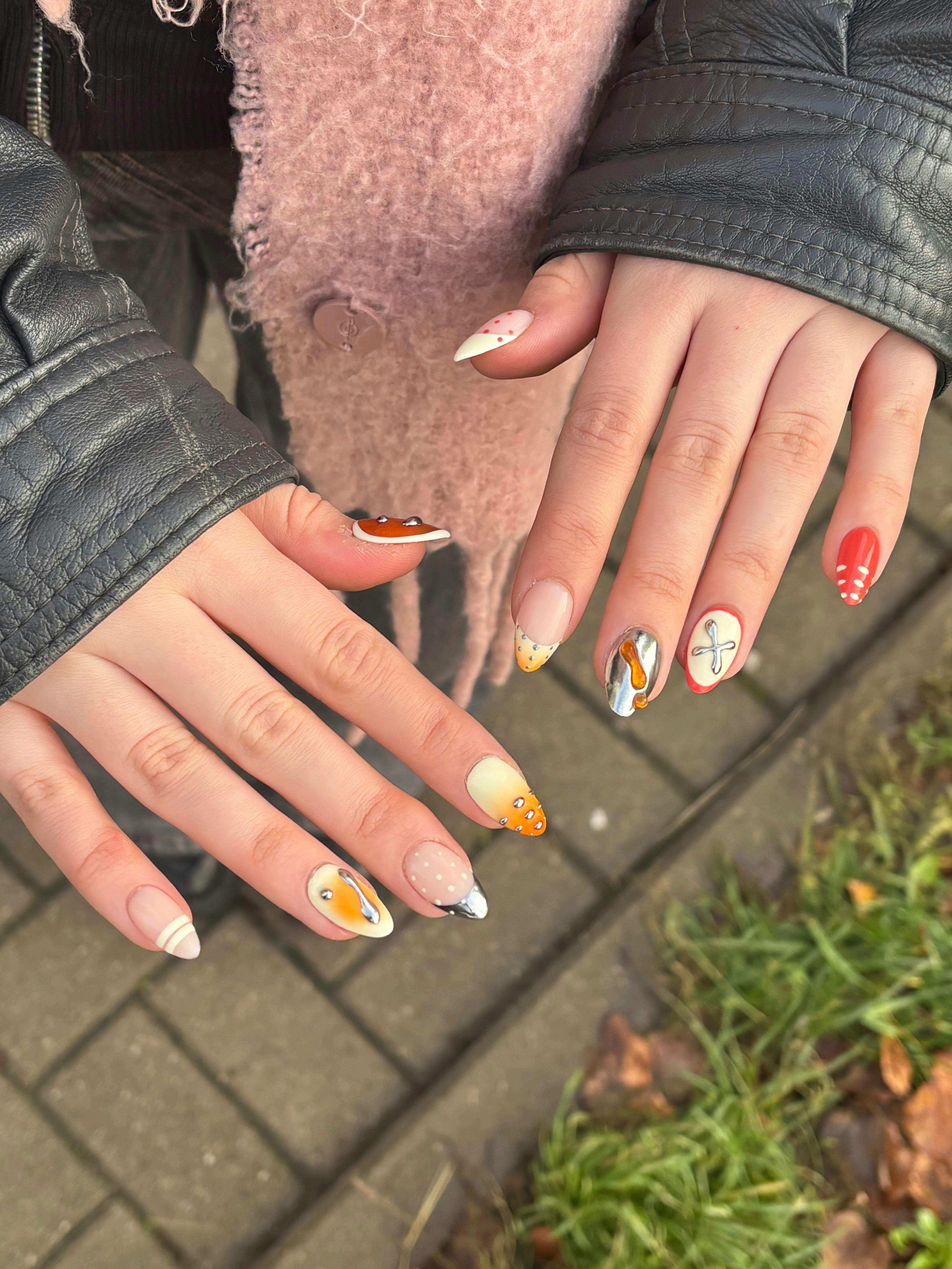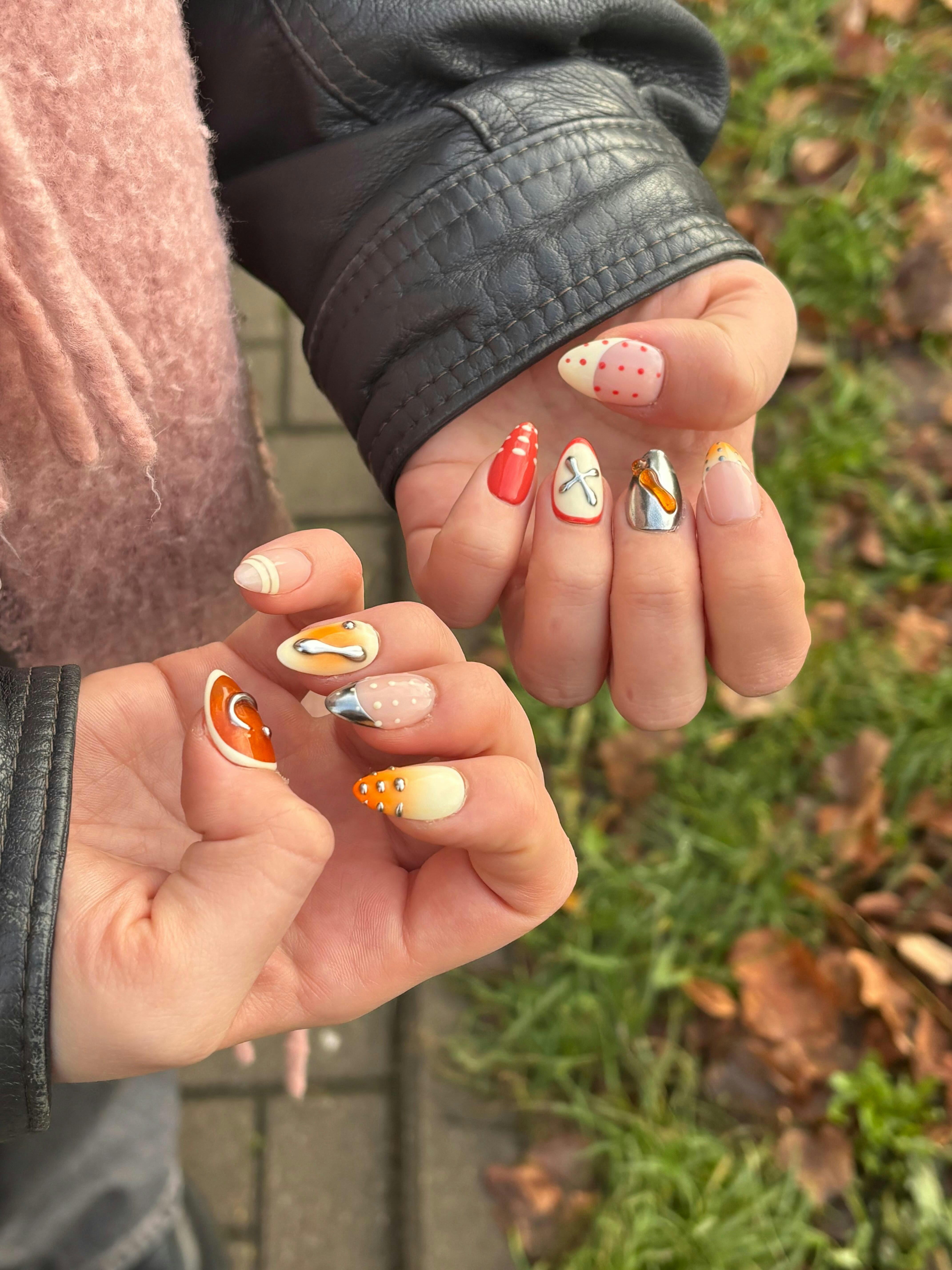 Liquidoty to artystyczna interpretacja klasycznego manicure — migdałowy kształt o długości ok. 17 mm, zbudowany na żelowej bazie z realistycznym apexem, który imituje świeżo wykonaną stylizację salonową. Ciepłe beże, kremowe tony i akcenty czerwieni przełamane chromowym efektem tworzą płynne, „rozlane” linie, metaliczne detale oraz subtelny french z charakterystycznym polka dot.